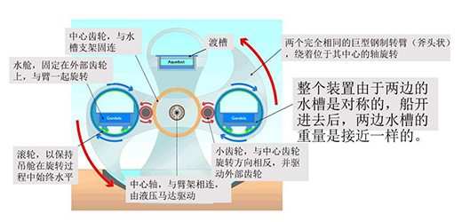 这一对大转轮,转轮两边各有一个对称的可封闭水槽,当轮船要由高水位运河开往低水位的运河时,先由高架水渠开入水槽内,然后把水槽封闭,接着大转轮缓慢旋转半圈,封闭水槽和轮子之间的齿轮运转,平稳地把水槽里的船只运送到低水位的河道里,再从人工河进入到运河里。