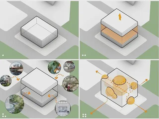 结合规划指标形成最基本的建筑形体,充分利用高度条件将形体上下拉开,形成的高大空间为建筑的功能保留更多可能,把交流互动、公园绿地、城市广场、展览空间等城市公共空间融入建筑,依据各公共空间的功能和尺寸,结合采光通风等要求形成建筑造型和体量。