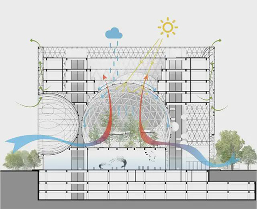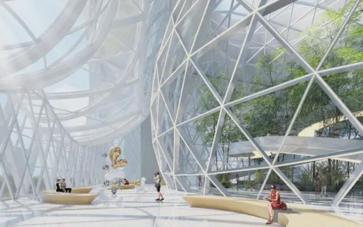 对于室外舒适环境时间较短,冬夏两季气候变化明显的唐山,设计团队希望通过应用先进的建筑技术,打造一个四季如春的活动场地,不仅可以承载更多的社会活动,同时也给市民带来绿色生态的体验,展示科技与自然的共生。