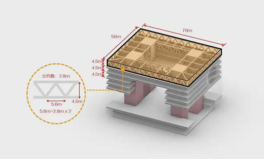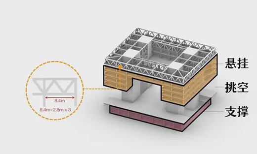 为实现城市客厅部分无柱的高大空间和立面的造型,设计团队在传统的结构形式上做了巧妙的处理。具有一层层高的钢结构桁架与四个核心筒紧密相连组成形似“板凳”的稳定支撑体系,上层的建筑楼板及幕墙钢结构悬挂在结实的顶部钢桁架上,完全解放中间的城市客厅。