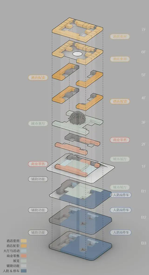 建筑功能围绕独具特色的城市客厅展开,城市客厅向整个城市开放,与展览交流等公共活动空间之间保持良好的视觉联系,营造出绿意盎然的活跃空间。展览与商业空间分布于建筑低层,能够更好地提升公共参与度与开放性。酒店功能位于建筑高层,保持私密性的同时能够拥有良好的城市景观视野。