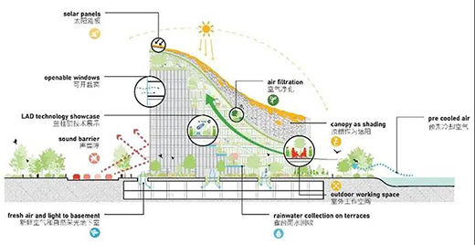 这个铺满绿植的退台设计起到了空气净化、调节微气候以及美化环境的作用,也间接为农业生产和公共教育做出了贡献。