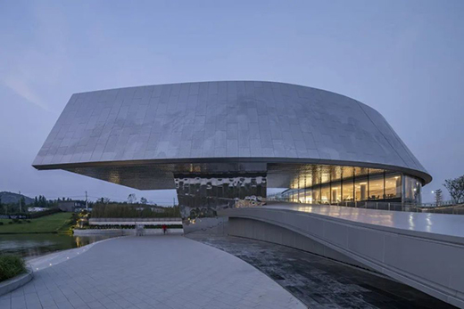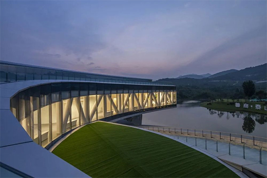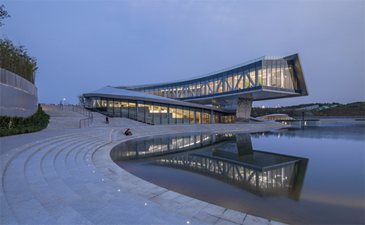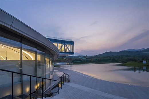 行云流水的“运笔”凝练着眼下水光的盈动与远处群山的浑厚,直至最高处端头近13米悬挑的“顿笔”,意欲将建筑与山水在此交融,“回锋”的笔触在场地中余韵未消,留下湖边步道蜿蜒曲折,顺应着建筑的流动曲线向外延伸,自然地将建筑形态过渡至户外空间。