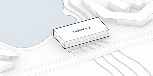 原始场地内东西方向有5米高差,东侧地势较高,连接景区主入口,西侧地势较低,连接景区内的主题广场。北侧拥有重要的景观面,直面园内的观景湖和远处连绵起伏的山景。