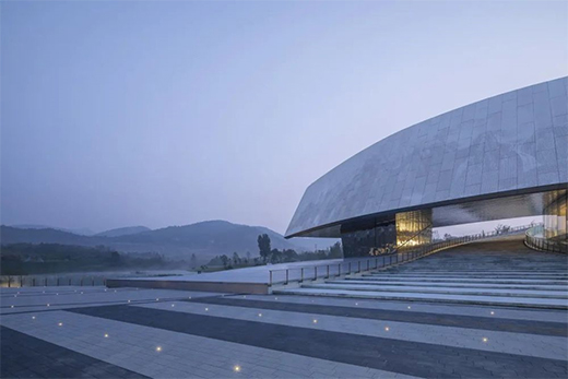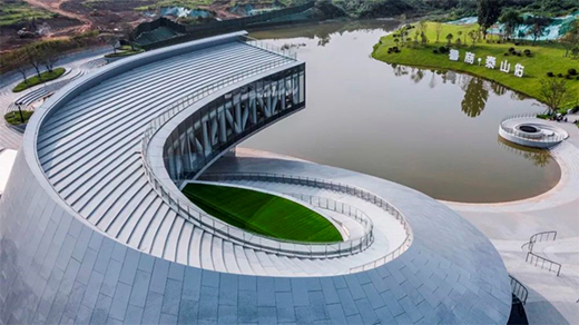 建筑从地面自然生长而起,一气呵成,以盘旋上升的姿态化作远处巍峨山势的延续,以舒展的曲线造型回应群山环抱的自然环境,同时巧妙地化解场地高差,顺势连接东西两侧的公共空间。