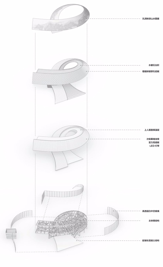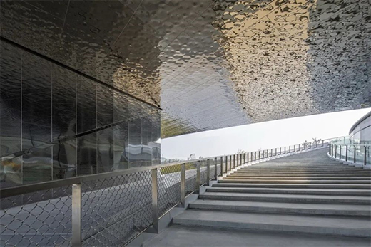 内圈玻璃幕墙以T型钢作为龙骨支撑,辅以四层中空超白玻璃。外圈双曲面建筑表皮经过优化后,分割为1040块银灰色穿孔铝板,其中大部分转化为平板,既节省加工成本,又保证安装的精确度。
