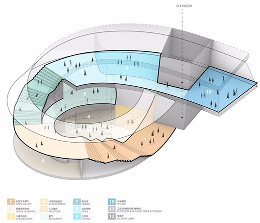 开放艺术展厅和图书馆布置在最为核心的台阶区域,由入口接待功能衔接;穿过沙龙及文创销售区,人们最终来到云端咖啡厅,远眺泰山。