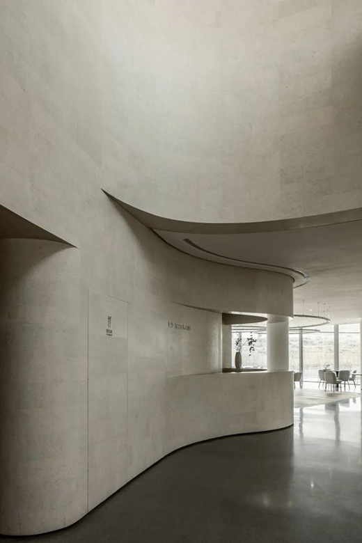 柔和的连续曲线作为整体设计语言在室内空间中得到延续。石材的厚重感和稳定的肌理突显空间的沉稳,整体的素色体系则强化了空间的静谧感。