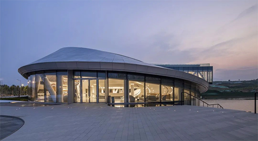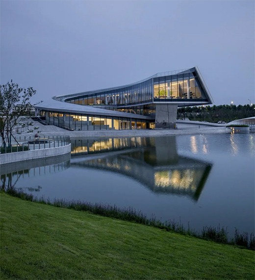 当夜幕降临时,银灰色幕墙曲线随着天光产生微妙的变化,倒映在粼粼的湖水中,与连绵起伏的泰山遥相呼应,将建筑融于场地和环境之中。