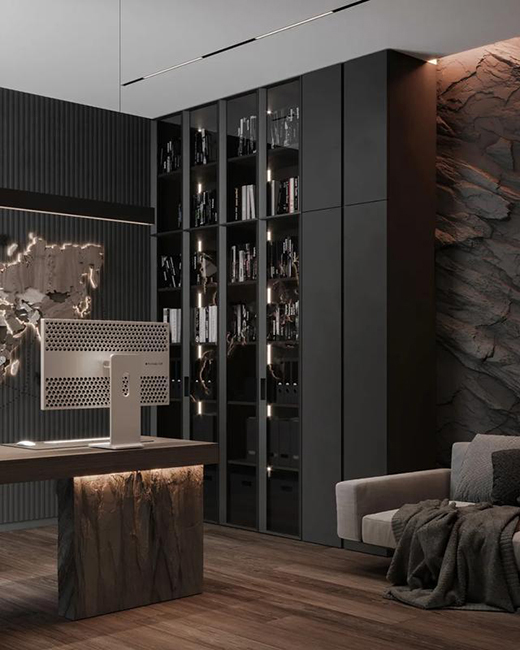 家庭办公室沿用了客餐厅的色调和材质,在静谧的空间里,一眼便捕捉到了墙面的世界地图,颇具创意感。粗矿的石材在整体空间中彰显更深层次的艺术效果。