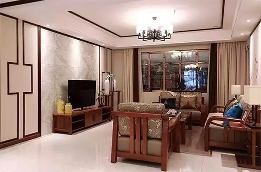 充满中式元素的木质装饰条与暗纹理墙纸作搭配,使整间客厅看上去显得时尚优雅又不失古典韵味。