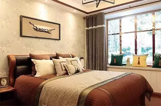 新中式卧室的色彩一般选用安静、悦目、舒适、沉稳的格调。新中式风格卧室的织物应与房间主色调一致,布置一两件工艺品可以使宁静的卧室富有生活的气息。