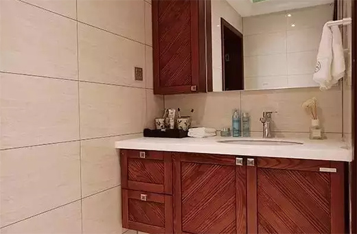 卫生间增加了一组吊柜,方便收纳物品,柜门选用斜纹突出现代感。