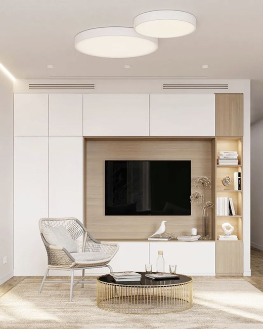 灯具的选择要适合客厅空间,太复杂的话会显得非常碍眼,影响美观。简单点的灯具装饰,多用筒灯或者镶嵌灯。简洁利落,多光源还不会留下死角,光照效果比一个主光源效果好很多。