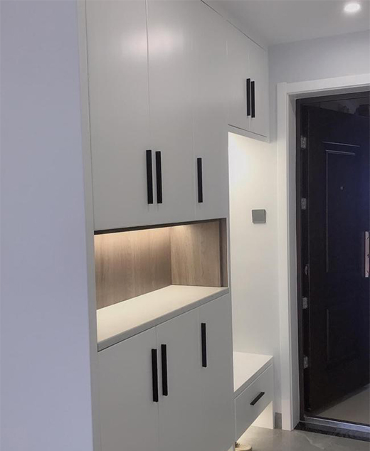 时尚简约的家装设计,灰白黑的搭配风格,温馨舒适还略带一些轻奢感。玄关柜整墙设计,空间利用最大化,平板柜门搭配黑色把手,靠门的位置设计了换鞋凳和挂衣区,安装了灯带,使用起来特别方便。