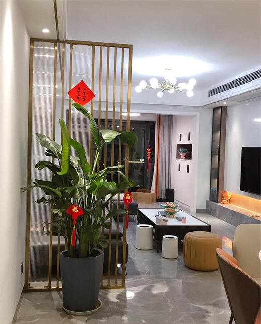 入户门正对沙发不喜欢进门就被看光的感觉,选择了金色铁艺隔断,不锈钢拉丝加长虹玻璃款,大气时尚高颜值。餐边柜选择了融入冰箱的设计,让厨房的空间能够宽敞一些。餐边柜设计了多种收纳空间,收纳效果非常好,厨房蓝色玻璃的推拉门,现代是时尚,L型布局,拥有一个小的阳台空间,洗衣机柜选择放在那里。