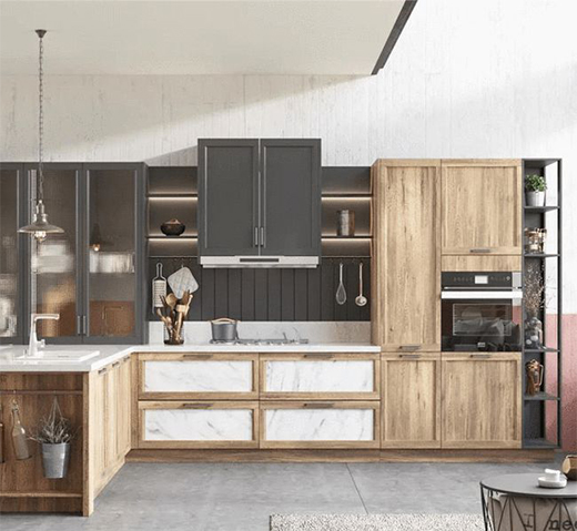 举个例子:欧派沙利托风格的L型橱柜,烤箱直接就在橱柜边上,不用多占空间。烹饪区与清洗区分开,厨房操作更加便利。