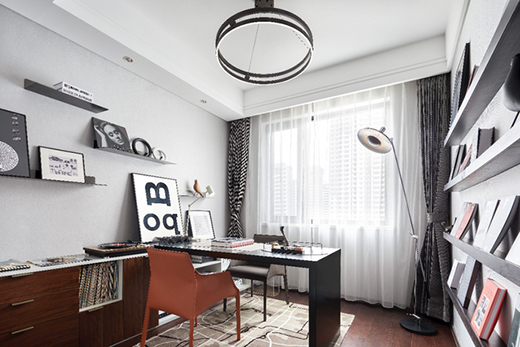 家里多处用到了这种圆形镂空吊灯,设计感极强,黑色的书桌略显质感满满,一切显得简单一些。
