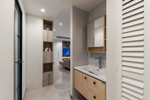 ▲卫生间洗手盆外置过道,会提升卫浴空间的功能实用性。