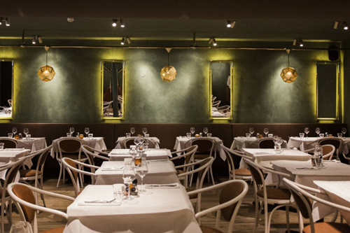 柔和的灯光,暗绿的主色调,宽敞的空间内布置了三种座位空间,中间是比较密集的用餐区,卡座设计精致、优雅,另一面是靠墙长椅,从镜子后方射出来的金色光芒使每一块镜子都像发光的水晶。