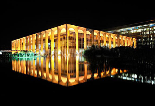 真的,不要忽视任何一个有潜力的建筑,夜幕降临后,这里都美炸了呢!这是巴西利亚的外交部大楼,整座大楼立身于湖水之中,被誉为水晶宫,这静谧的氛围好歹也可以让我们从喧闹的足球场中暂时解脱一下啦!而这个建筑最特别的在于建造它的设计师——奥斯卡·尼迈耶。