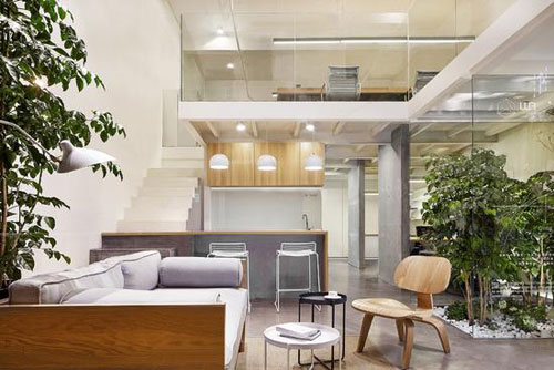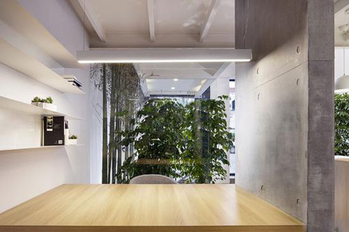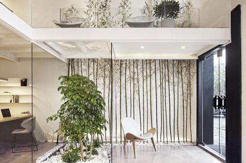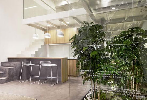 1层的独立办公区域被隐藏在植物后,办公区视野尽端为精心营造的室内景观。
