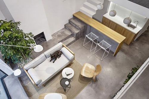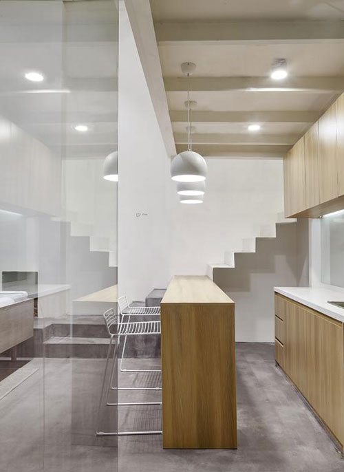一、二楼的空间通过轻薄的楼梯 (楼梯 装修效果图)连接,水泥、木、金属组成空间之间独特的对话,吧台与楼梯之间的结合也是“看似随意”的精心设计。