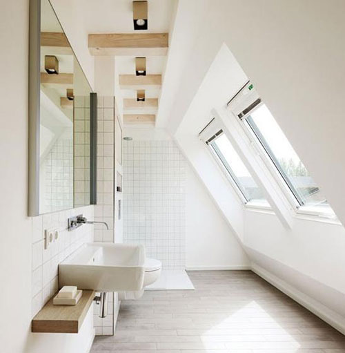 不同角度上的天窗带来的光线是不同的,这间阁楼也许是角度的问题也许是主人的故意为之让到达空间的阳光变得非常稀少。两扇相隔较远的天窗让整个洗漱区都藏在了阴影中,但由于空间狭小低矮的缘故,室内异常明媚。