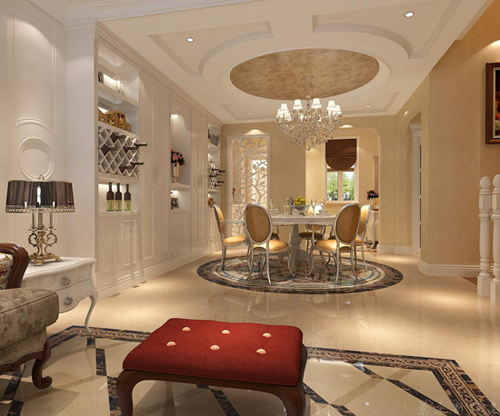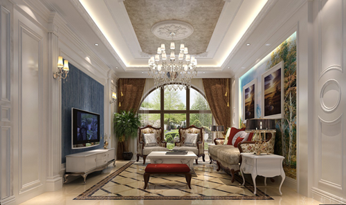空间的布置多采用对称式的布局方式,空间的色调以暖黄色为主,落地窗既引入了光线,又拓展了视野。屋顶的装饰线简洁明快,层次感较强。家具没有过分的装饰,一切从功能出发,讲究造型比例适度、空间结构明确。