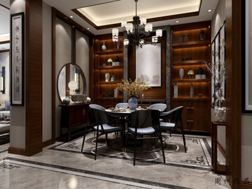 在龙湖.香醍溪岸一案中,古典韵味弥漫整个空间。餐厅以棕色的实木家具为主,精美沉稳。顶棚上的古式宫灯隐伏在灾木椽之内,线条简单,却把现代感融入了古典。四壁挂有书画条幅,与陈列在墙柜上的古玩瓶饰相映成趣,营造一种雍容古雅的氛围。周州巧妙运用月亮窗,既沟通了餐厅与其他空间,又产生一种雾里看花的朦胧之感。