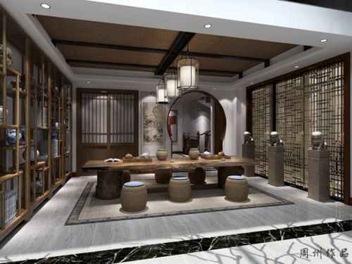 屋主喜好以茶会友。设计师从其性情与需求出发,打造了一间简约却不简单的古韵茶室。月亮门旁挂有长幅苏绣,一侧的竹帘在夏日里透着丝丝凉意,象征着主人高洁的品质。正中垂挂着的羊皮南瓜灯,散发着柔润的光,整个茶室古韵悠悠。约两三好友,于此天地稍歇,饮茶、谈天、对坐,人生乐事也。