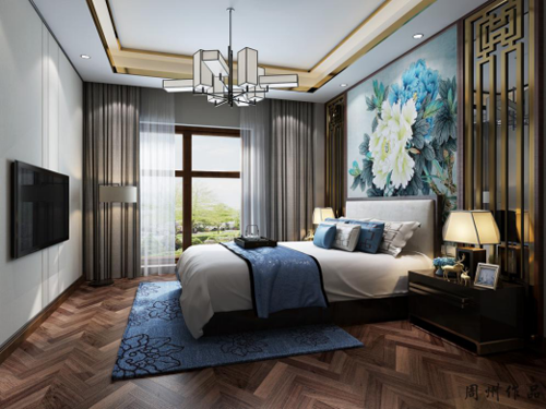 在湖畔观邸住宅设计中,周州根据居住对象打造个性空间。女儿房中主要为棕、白、蓝三色,在色彩方面秉承了传统古典风格的典雅和华贵,但又加入了很多现代元素,呈现着时尚的特征。睡枕、地毯、墙画都是空灵的蓝色,营造了安宁的氛围;纱帘与墙壁的纯白色则透露出女儿的纯洁与浪漫;床前巨幅的墙上花朵热烈绽放,正如其青春般烂漫。床前柜上放置的摆件活泼时尚,整个居室在浓浓古韵中渗透了几许现代气息。设计是人与空间之间的对话,周州的设计正是根据不同人的性情与喜好,打造出不同气韵的空间。