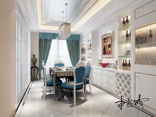 餐厅以白色为基调,窗帘与餐椅的墨绿色点缀其间,淡雅温馨。从落地窗引进的光线,令整个餐厅敞亮。两边对称的储物柜,既具有实用功能,也以其独特造型尽显美观。墙壁上的挂画色彩鲜艳,给空间增添了一抹活泼亮丽的气息。