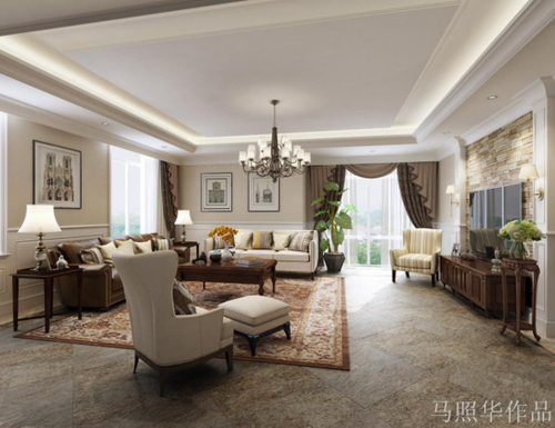在这个项目中,马照华在整体风格上选用休闲自然、不做过多装饰的美式风格。客厅以暖色调为主,石材的选择上都是哑光酸洗面,颇有古堡石材特点。家具的选择上也以柔软的布艺为主,沙发座椅皆为柔和的米色系,视觉上感到舒适、温馨。