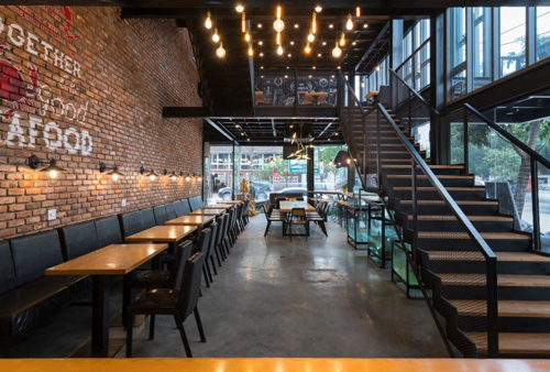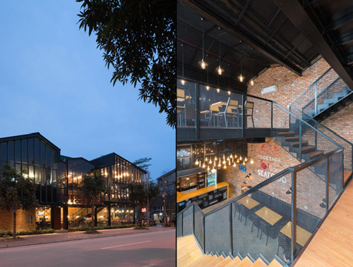 CRABSARK&CRAWFISH是一家位于越南荣市文城中心的海鲜餐厅。餐厅由结构钢、玻璃、裸砖和柔性曲线组合而成。餐厅由6个空间组成,包括不同的功能,分别由放置了5个不同高度,并通过许多灵活的楼梯相互连接。餐厅的外部是现代建筑,受东方文化的影响,采用了砖的暖色、钢材的颜色和木制的颜色,显得室内空间温暖而友好。