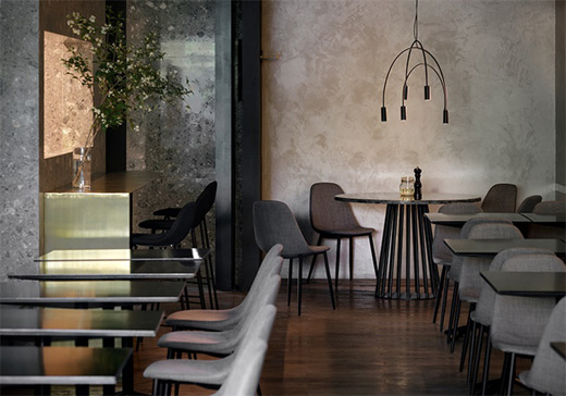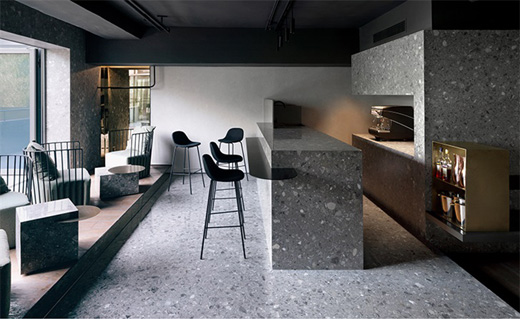 在这长条形的空间里,南侧从酒店大厅起至北侧面向一条河流打开。沿着长条形空间,设计团队设计了一系列不同的微环境-从公共的到私密的,借用自然光线介入空间的不同的姿态为使用者创设不同的空间氛围。一个可完全开启的大型折叠门意在吸引顾客走进餐厅吧台和餐区。特制的黄铜屏风插在独立的石头吧台上,成为空间中精致优雅的视觉焦点。一些由黄铜制作的小元素节制地点缀在空间之中,丰富空间的同时并不打破原本优雅的灰色调。吧台区域为各种形式的社交活动提供了足够的可能性。