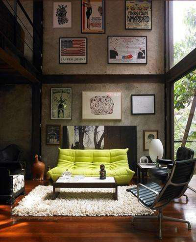很有怀旧色彩的客厅设计,小复式的客厅层高很高,刚好可以利用高大的墙面来展示自己喜欢的东西,比如长时间收集的不同时代的画作。