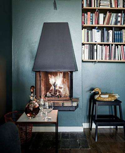 这是客厅的一个角落,暗蓝色的墙面让这个空间显得很暗淡,但是壁炉和书柜的设计就让这个小角落有了些许的文艺气息,尤其是在冬天的午后,这个角落简直不要太舒适了,拿着一本书窝在壁炉前,温暖又幸福。