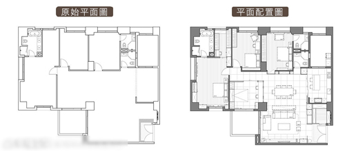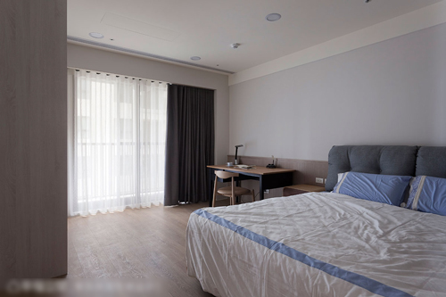为满足屋主喜欢的简约温馨感,卧室也延续公领域的温润木色,分别加入不同色系与质材,例如主卧房以女主人喜爱的淡紫色为主色,并利用绷布和铁件勾勒出精致感;女孩房的墙面以暖灰色和木皮做跳色,利用造型层板营造女孩的软萌特性;长辈房则考量到给儿子居住的可能性,并以长辈能接受的简约设计,搭配年轻人喜欢的粗犷质感板材,保留了未来成员变动的弹性,同时围塑出舒适又不失个性的舒眠气息。