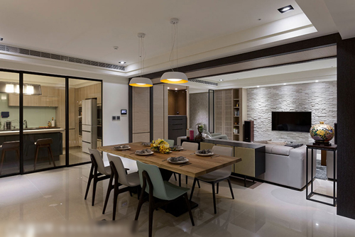 设计师在本案中,跳脱特定的风格框架,以屋主向往的简约温馨为诉求,以暖色系为基底,大量木皮带来温润感,再透过特殊材质的变化,使空间远观呈现高雅内敛感,细看则处处令人惊艳。例如玄关墙选用仿古面石材,搭配带金属光泽的仿漆质感壁纸,营造高雅精致的入门印象;进入公领域,灰木纹劈面文化石的电视墙,不多加修饰地展现出原始质感。而连结客餐厅的天花梁柱,则利用深浅色木皮,塑造出沉稳质感,更巧妙修饰了大型柱体,让空间更显方正敞朗。