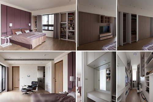 而私领域收纳更为精彩,利用梁体造成的落差深度,沿着立面安排了三面的环绕式收纳,百分百地运用了每个畸零空间,而更衣室则利用开放、封闭、吊挂、抽屉等多元形式,满足屋主于公于私的大容量收纳需求。