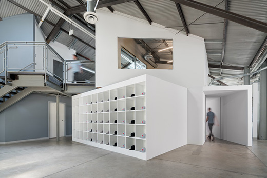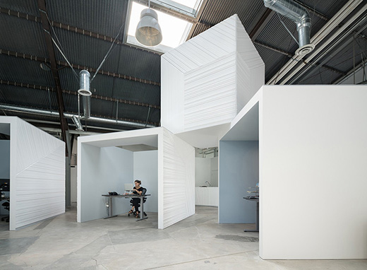 当被要求重新考虑办公室的组织时,设计师将员工的身份的轻松与一系列颠倒的隔间相匹配,这些隔间有趣地挑战了典型的办公空间的规律性。整个大型开放式办公区松散组织,非正式的安排创造了多样化的稳定和灵活的工作配置。此外,设计上充分利用了仓库外壳的天花板高度,将箱体堆积起来,使视觉上突显和投影区域。在用cnc研磨的MDF的表面处理和涂上细节的表面处理这些翻滚的立方体。从特定的角度来看,这些铰接的表面创造了空间错觉和活跃、动态的工作氛围。