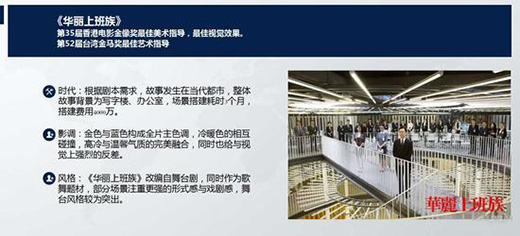 以《华丽上班族》作为案例分析,故事发生在当代都市,金色与蓝色构成全片主色调,冷暖色的相互碰撞,高冷与温馨气质的完美融合,同时也给予视觉上强烈的反差。空间布景多利用条框隔出或用玻璃隔断,例如顶部用白光点缀,底部黄色线条分割,不仅打破了单一色调的压抑感,更有未来主义的空间感。办公区、家居场景设计前卫,整体非常奢华、现代。