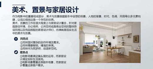 美术、置景的工作在很大程度上与家居设计重合,针对家庭居住空间进行整体陈设风格和饰品搭配的家居设计师们,仿佛就是现实生活中的美术与置景。他们同样面对复杂的创作环境及需求,同样需要敏锐、精准的审美,同样作为筑梦师创造新空间。