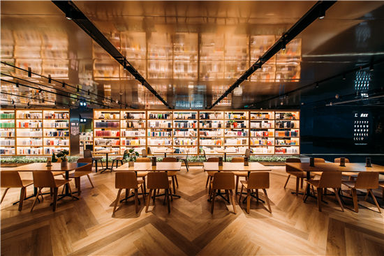 设计团队大胆使用黑色作为主色调,黑色的深沉基调配以木质暗金,呈现出黑金的视觉效果,不仅可以在设计上凸显产品与主题区域,进一步强调峻佳设计“Design Beyond Eyes”的体验式设计理念,同时书店给人印象是无限智慧和无穷的探索,黑色与这隐喻正相配合。