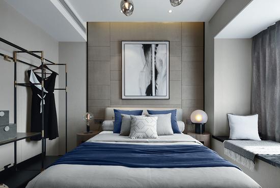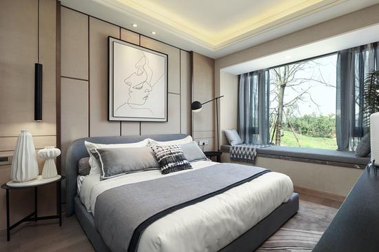 卧室的布置,干净利落,线条简约的装饰画和饰品,有着雅痞绅士的克制,色调沉稳的让人安心,而床的那份直接的亲和舒适感让人忍不住要跟它亲密接触。