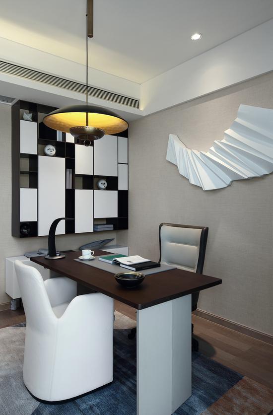书房,简洁的设计线条与偏冷的色调搭配以柔美的家具、还有几何造型的摆设,在冷静与跳动间找到了让人舒适轻松的氛围。