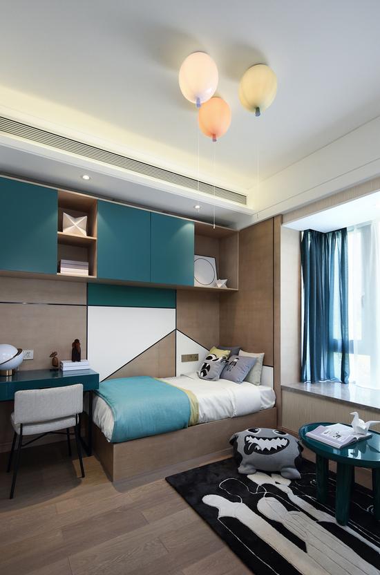 在儿童房中,设计师加入了经典的宝石绿,规则有序的铺开,缓缓的点燃童心,让人感受到稳稳的喜悦和安全感 。