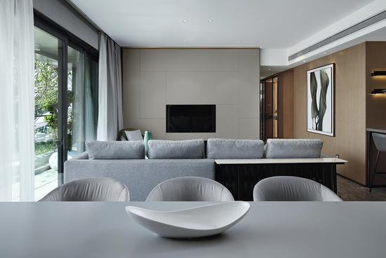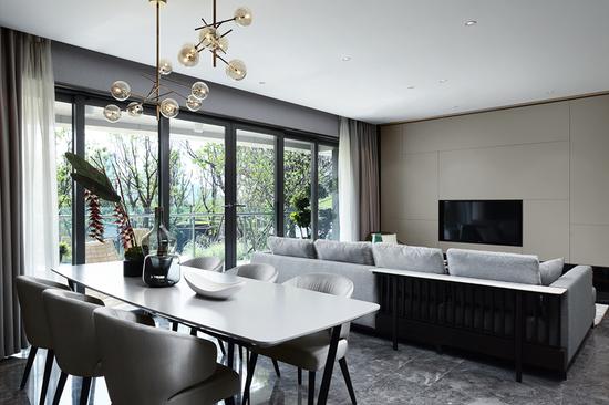 暗金色的旋律如一席暖流贯穿客厅餐厅,含蓄而有条理地梳理着棱角,也给灰色的布艺加入舒适的情绪。