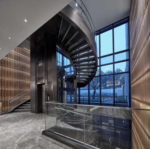 我们对这个建筑本身做了一些调整,玻璃的旋转楼梯和户外的光线,加上非常大的地面挑空让采光井更宽大,让地下室可以有更好的采光效果。地下室作为会所,这里面空间排布相对比较生硬,我们利用中间的圆厅将分开的部分做个结合。